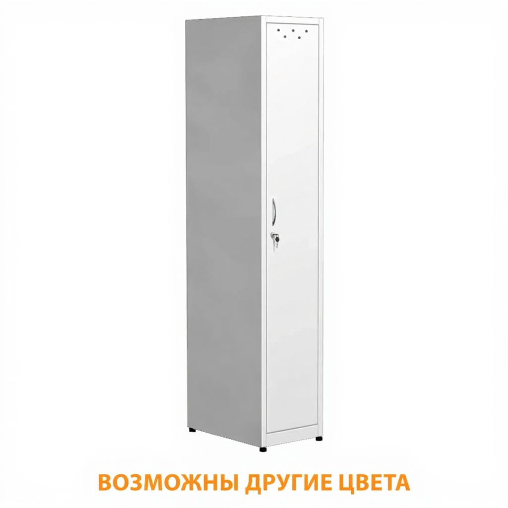 • Наполнение: один отдел, 1 дверь, замок, отверстия для вентиляции. Шкаф оснащен полкой под головные уборы, перекладиной для плечиков под одежду.
