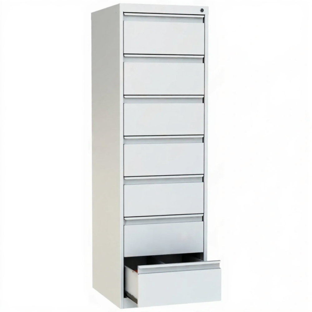 - Эргономичная компоновка с двумя колоннами — семь выдвижных ящиков, расположенных в две колонны (4 и 3 ящика), обеспечивают удобный доступ и рациональное использование пространства как по высоте, так и по ширине. Такая конструкция облегчает поиск и работу с картотекой.