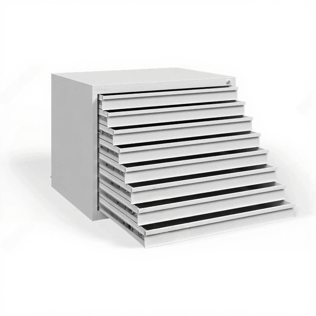 Шкаф картотечный ШКР-8, формат А1 — это специализированное решение для систематизированного хранения, защиты и удобного доступа к чертежам, проектным планам, схемам, картам и другим документам большого формата в конструкторских бюро, архитектурных и проектных организациях, учебных заведениях и на производственных предприятиях. Модель с восемью выдвижными планшетами обеспечивает надежную сохранность и идеальный порядок для крупноформатной документации.