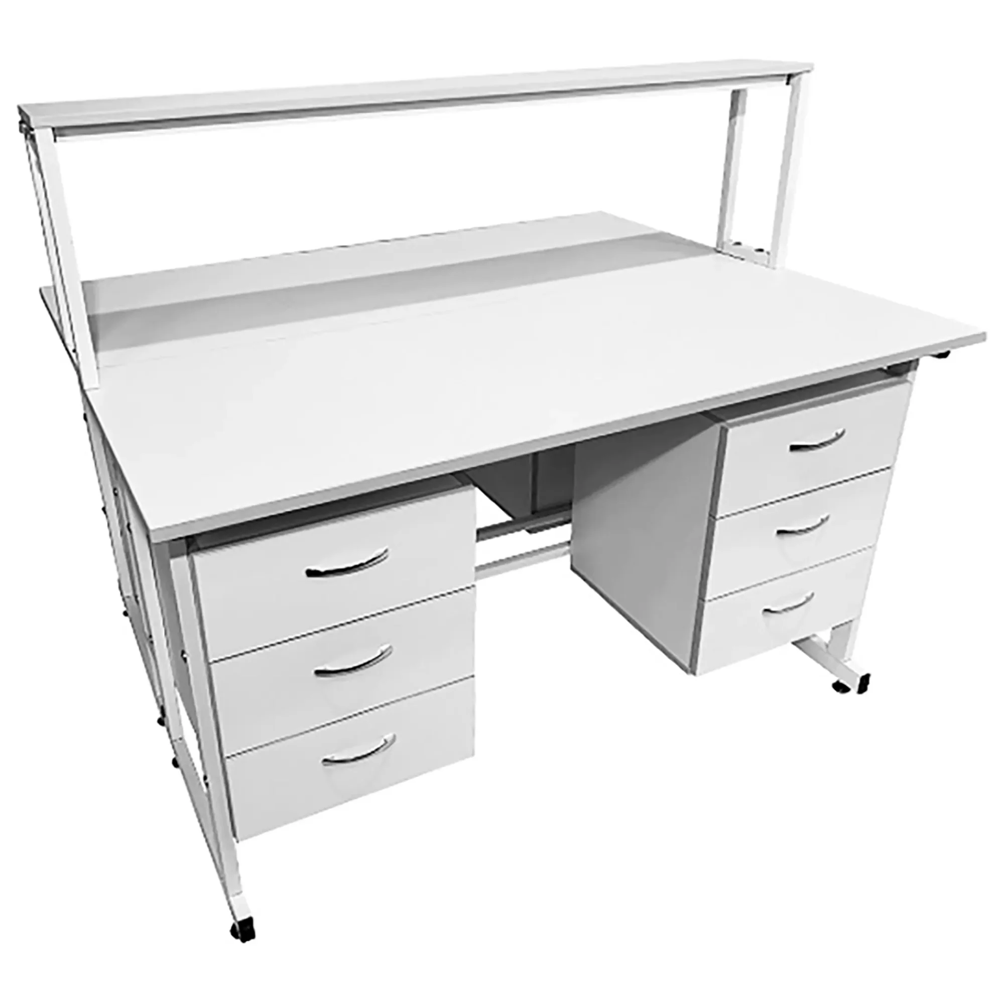 Стол лабораторный островной с надстройкой Сло 22.011 (белый) — это идеальное решение для организации сразу двух рабочих мест в лабораториях и медицинских учреждениях. Модель обеспечивает рациональное использование пространства и максимальный комфорт для сотрудников. Каждое рабочее место оснащено двумя подвесными тумбами с тремя выдвижными ящиками, а центральная надстройка имеет одну полку. Каркас выполнен из стального профиля, столешницы из ЛДСП толщиной 22 мм.