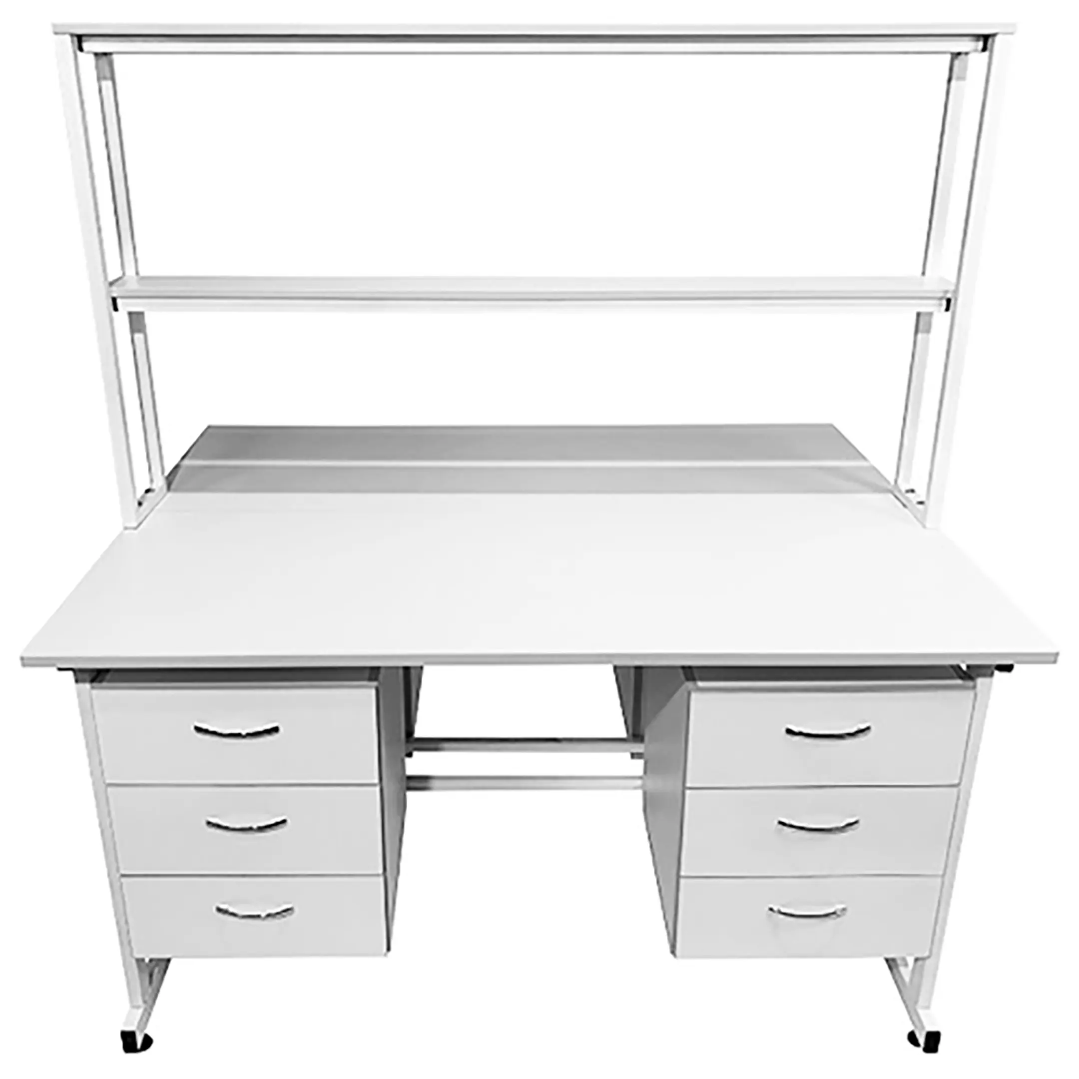 Стол лабораторный островной с надстройкой Сло 22.017 (белый) — это превосходное решение для создания двух рабочих мест в лабораториях и медицинских учреждениях, оптимизирующее использование пространства и обеспечивающее комфорт и функциональность на рабочем месте. Модель оснащена двумя рабочими местами, каждое с двумя подвесными тумбами, имеющими три выдвижных ящика, и центральной надстройкой с двумя полками. Каркас выполнен из стального профиля, столешницы из ЛДСП толщиной 22 мм.