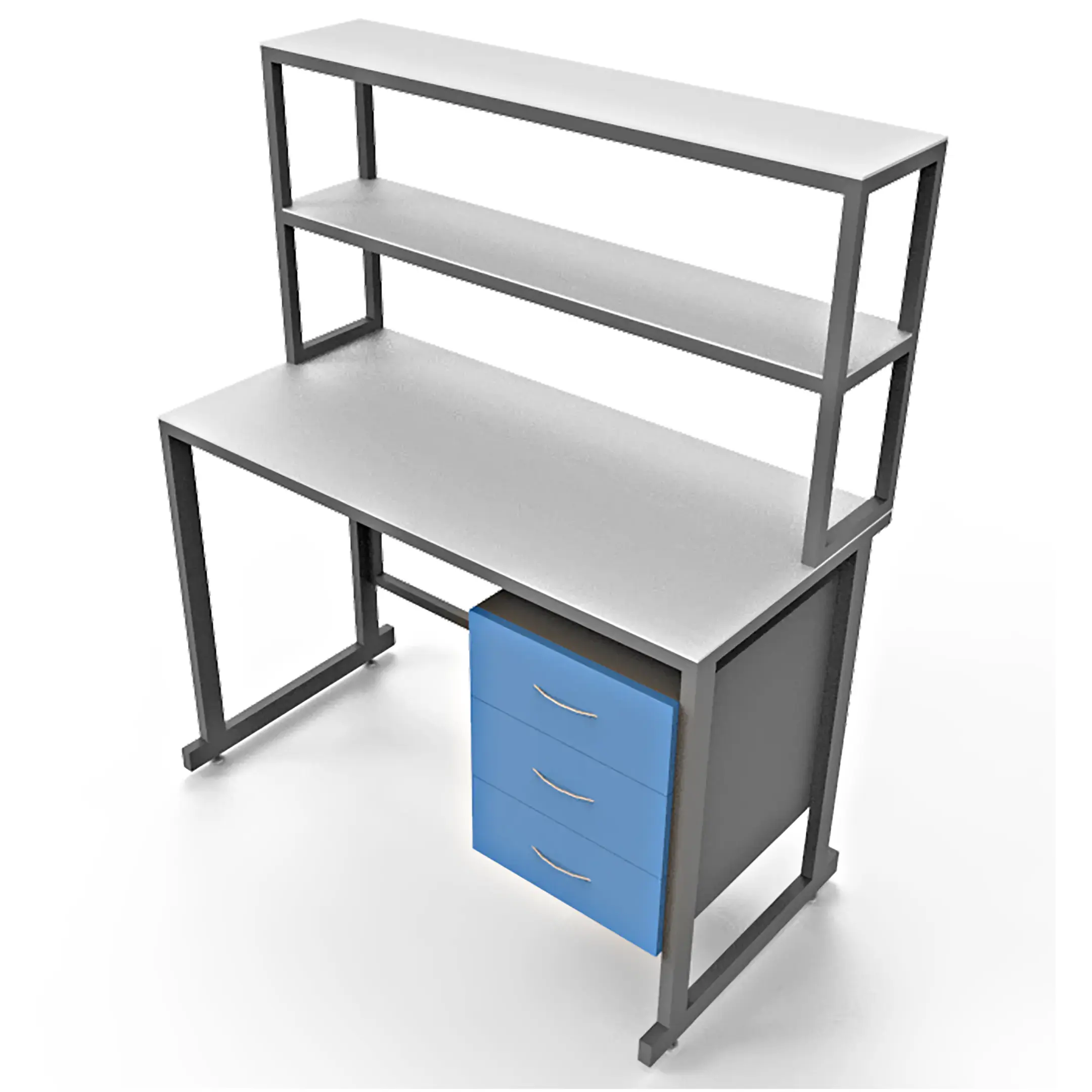- Удобная система хранения — тумба под столешницей с тремя выдвижными ящиками и надстройка с двумя полками для хранения материалов и инструментов.