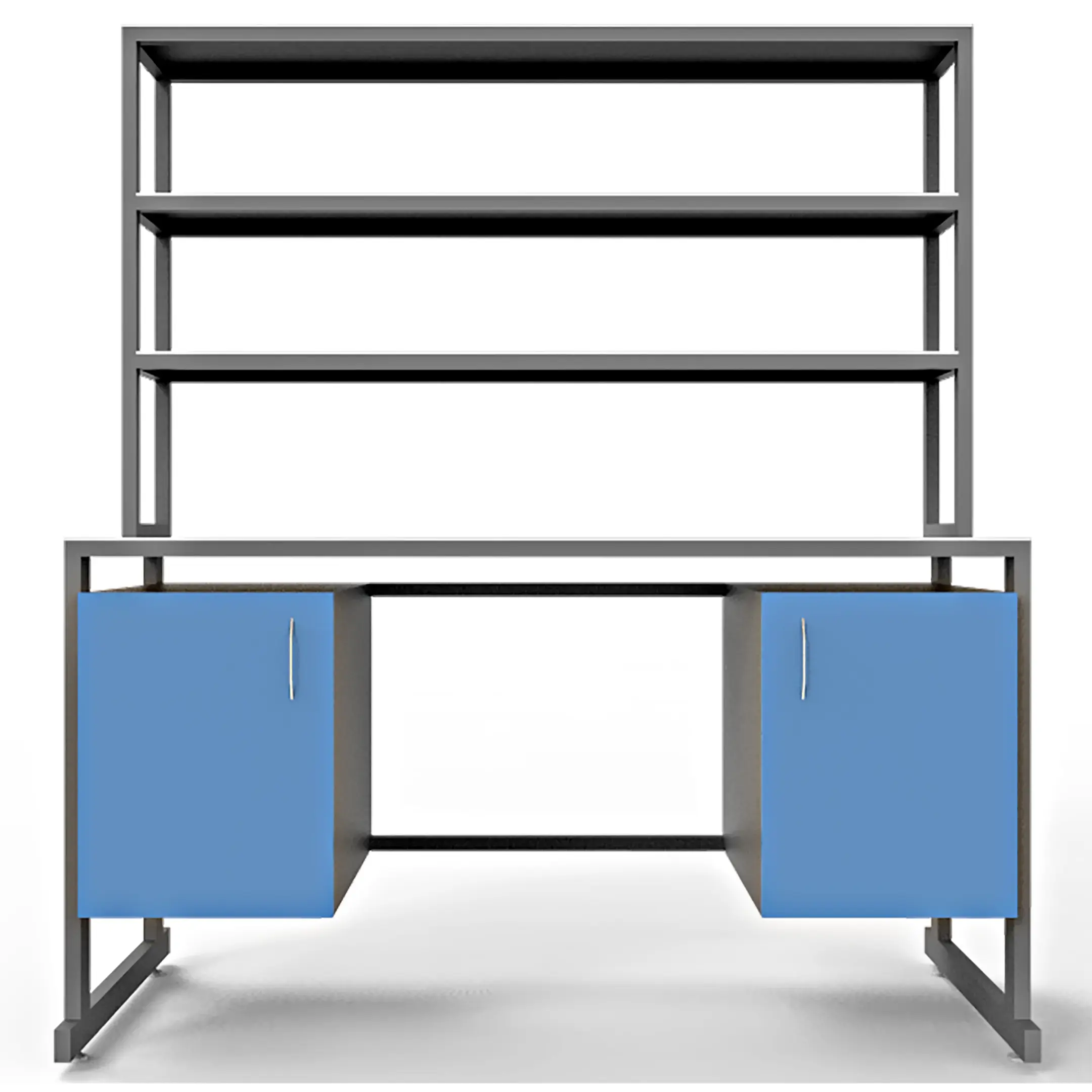 - Вместительная система хранения — надстройка с тремя полками и две тумбы под столешницей с распашными дверцами для хранения оборудования.