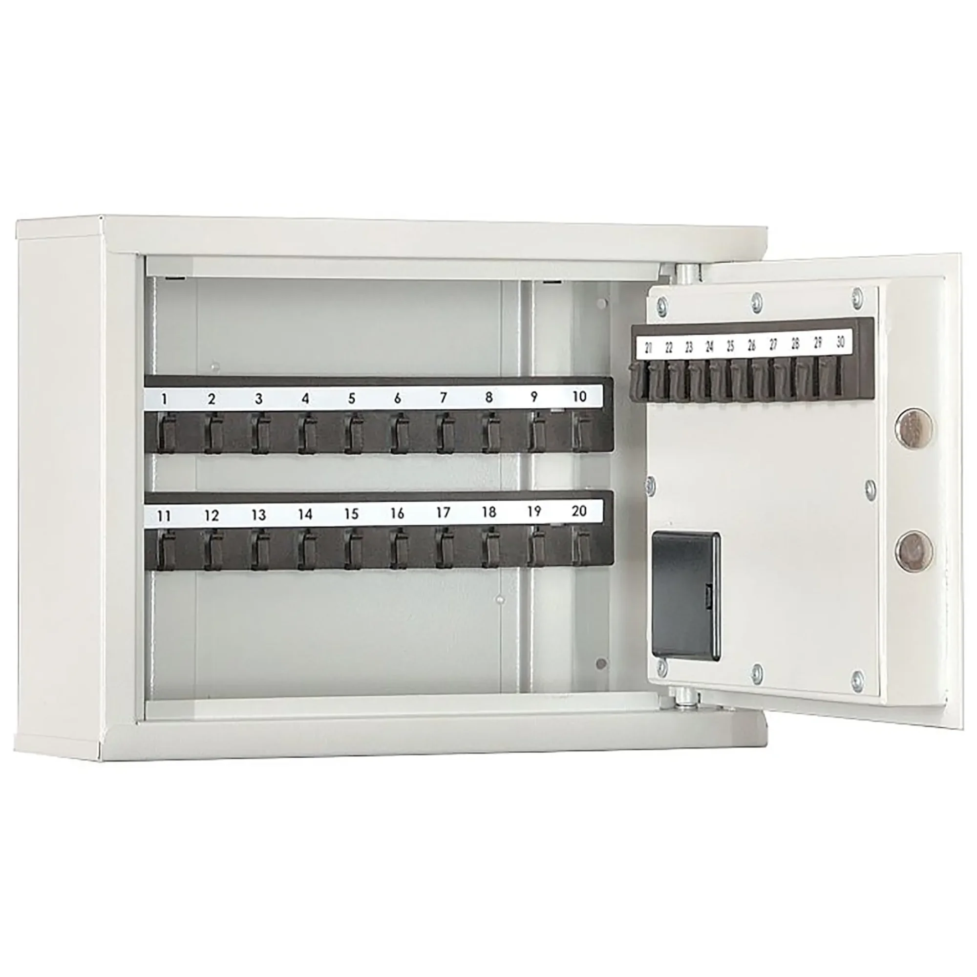 - Компактность и целевая вместимость — система предназначена для хранения до 30 комплектов ключей, что идеально подходит для организации порядка в кабинете руководителя, на стойке администратора, в диспетчерской или на небольшом посту, где важно контролировать ограниченный, но критически важный набор ключей.