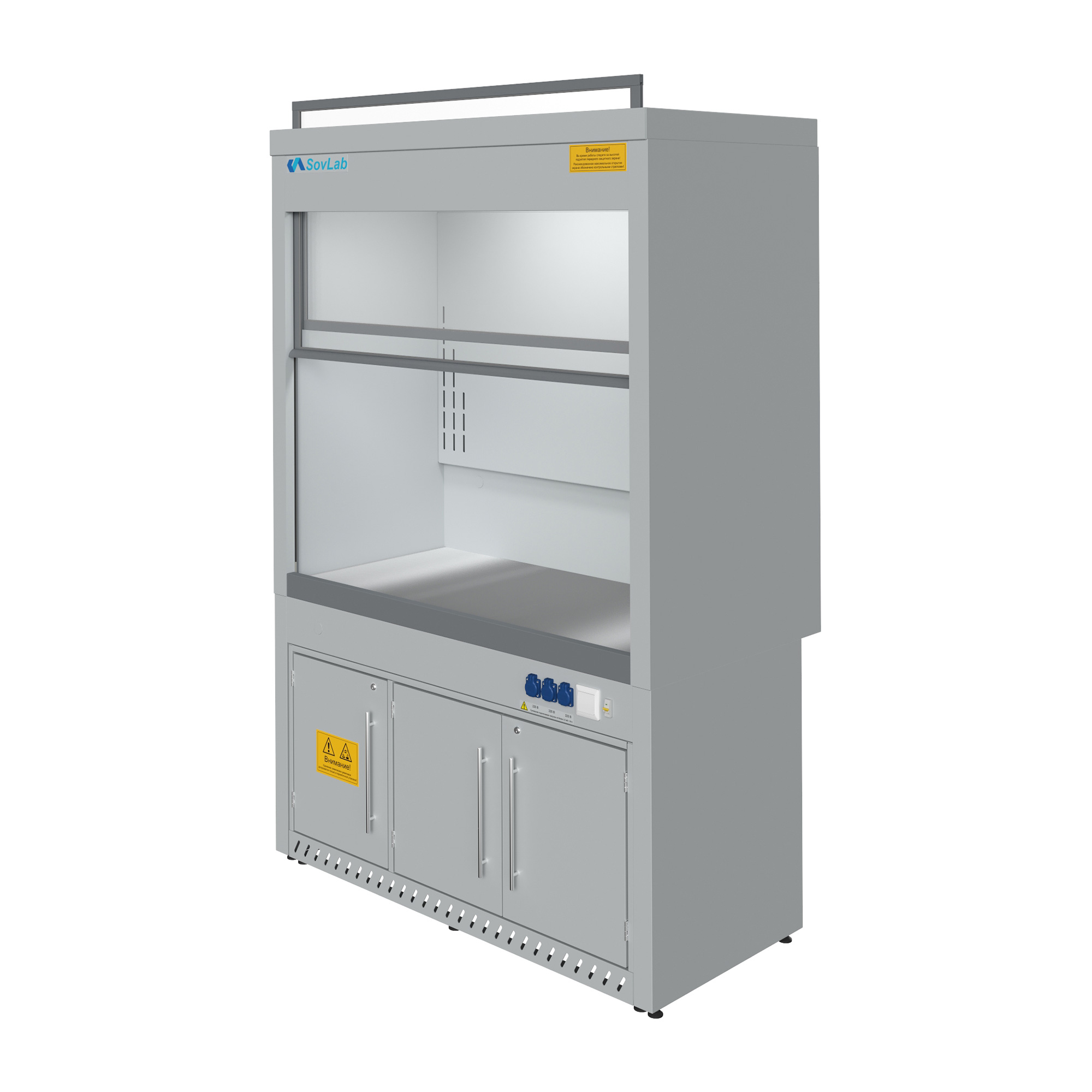 - Безопасная работа с летучими веществами — вертикально-подъемный защитный экран из ударопрочного стекла с системой противовесов для плавного хода и фиксации.