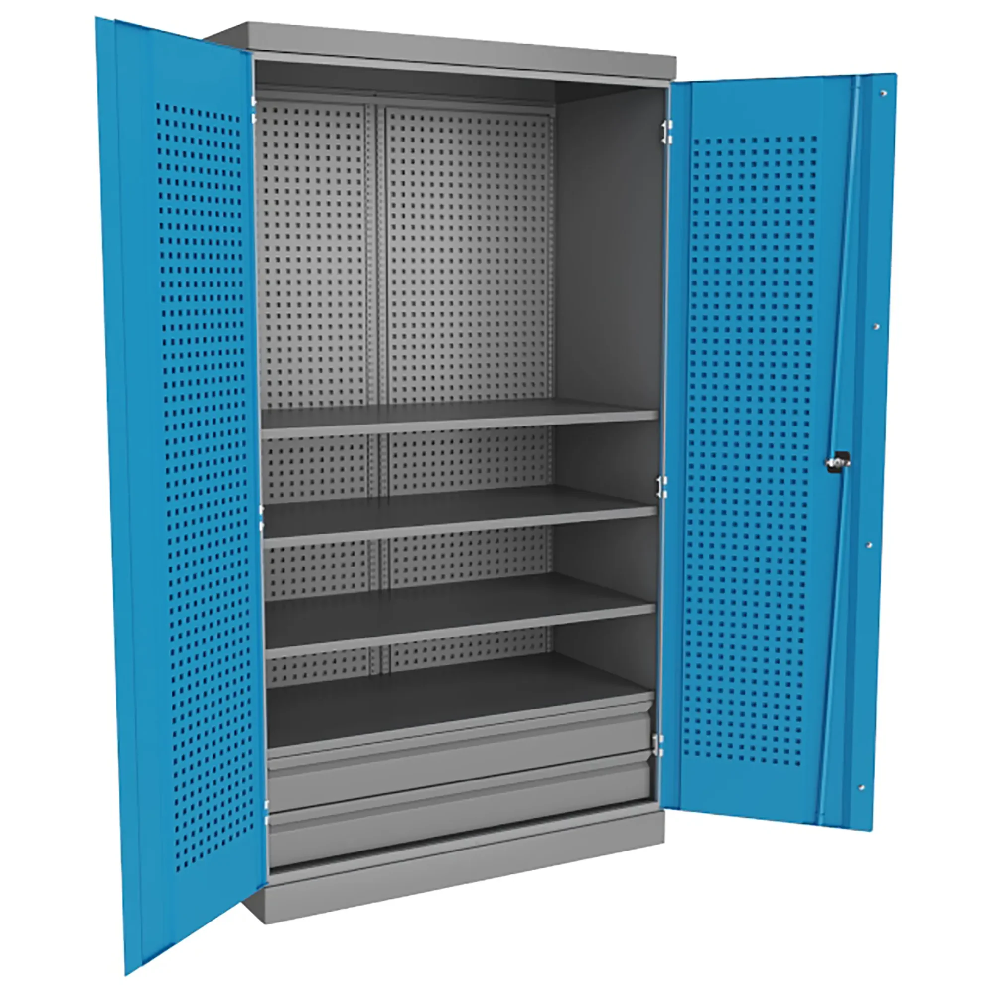 - Надежная защита инструментального парка — цельнометаллический корпус с запирающимися на общий замок дверями обеспечивает защиту содержимого от хищений и несанкционированного доступа. Закрытая конструкция также предохраняет инструмент от производственных загрязнений: пыли, стружки, масел и влаги.