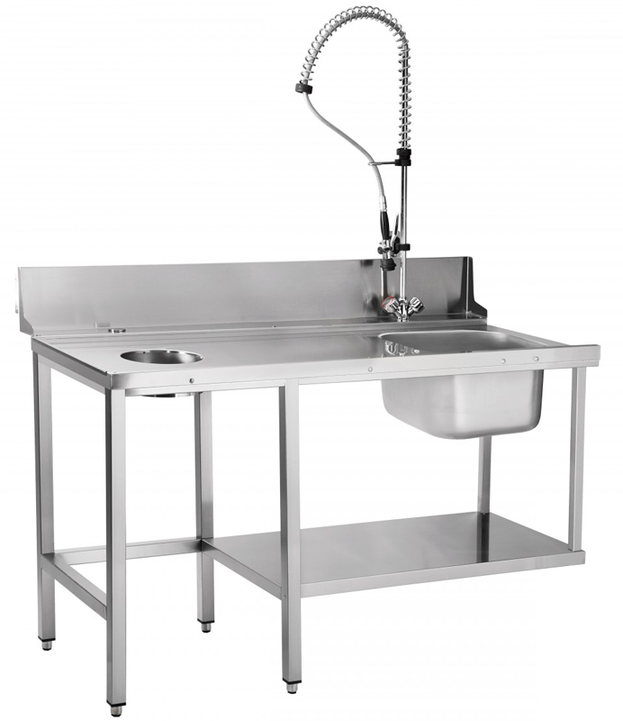 Стол представляется собой рабочую поверхность для сортировки грязной посуды. Оснащен отверстием для сбора крупных отходов. Главное место в конструкции занимает мойка с душирующим устройством. Мойка изготовлена цельнотянутым способом, душ подключается к горячей и холодной воде.