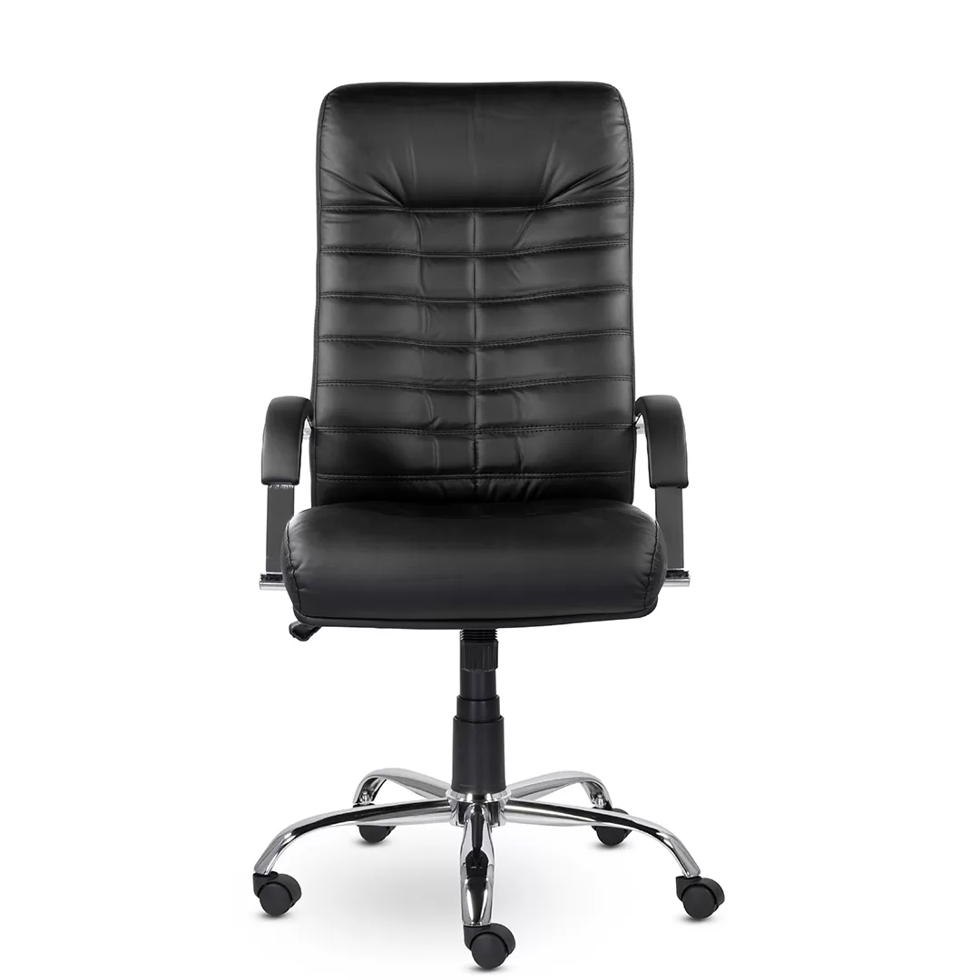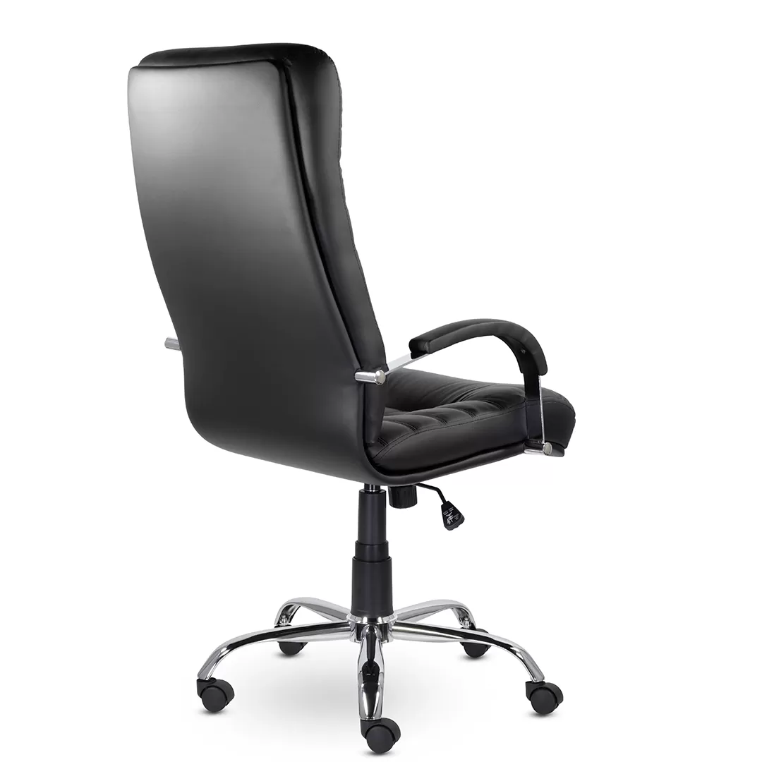 Массивное кресло руководителя оснащено горизонтальными прострочками по всей ширине спинки и хромированными подлокотниками с мягкими накладками. Механизм качания позволяет регулировать высоту сиденья, обеспечивает режим свободного качания и фиксацию каркаса в рабочем положении. Максимальная нагрузка составляет 120 кг.