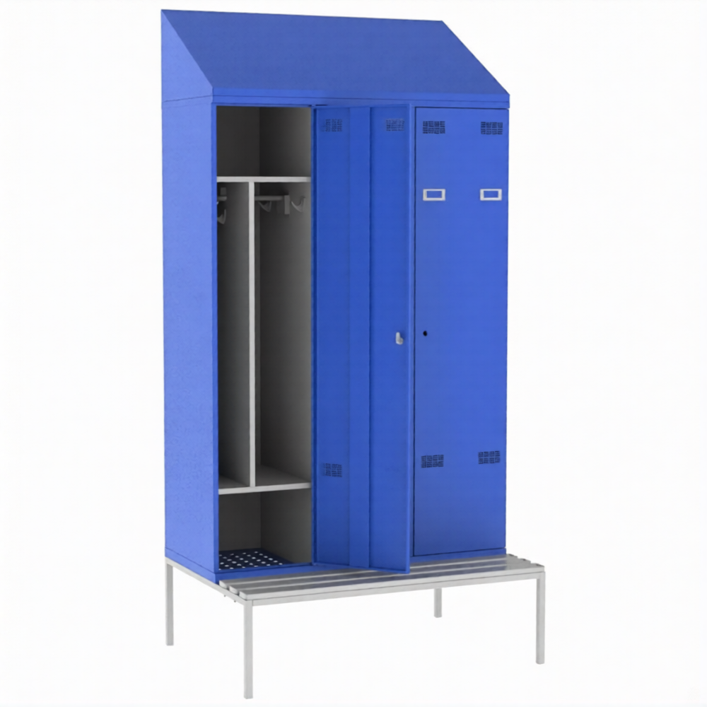 - Шкаф металлический для хранения одежды имеет сварную конструкцию. Для удобства проведения влажной уборки под шкафом модель установлена на подставку. Для удобства переодевания имеет скамью