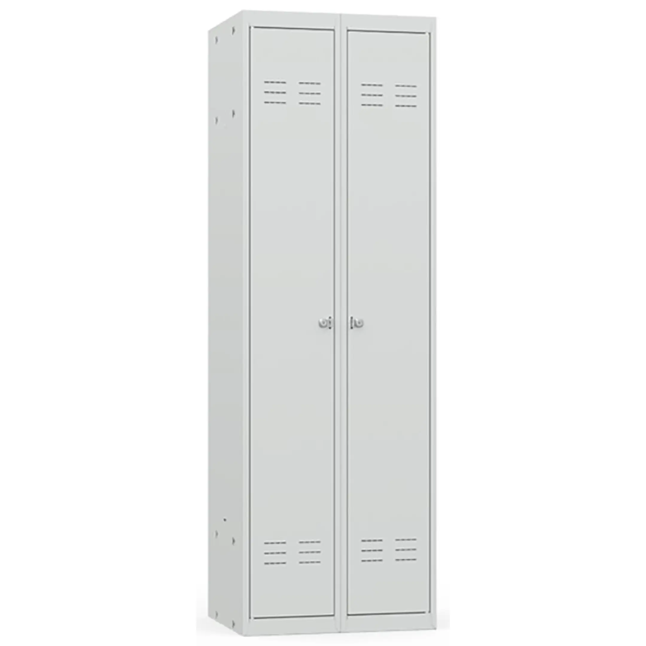 • Шкаф имеет две секции, каждая из которых оснащается полкой для головных уборов, пластиковыми перекладиной для вешалок и двумя крючками для одежды, проушиной для навесных замков;