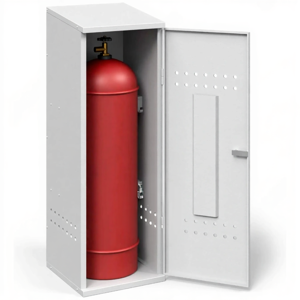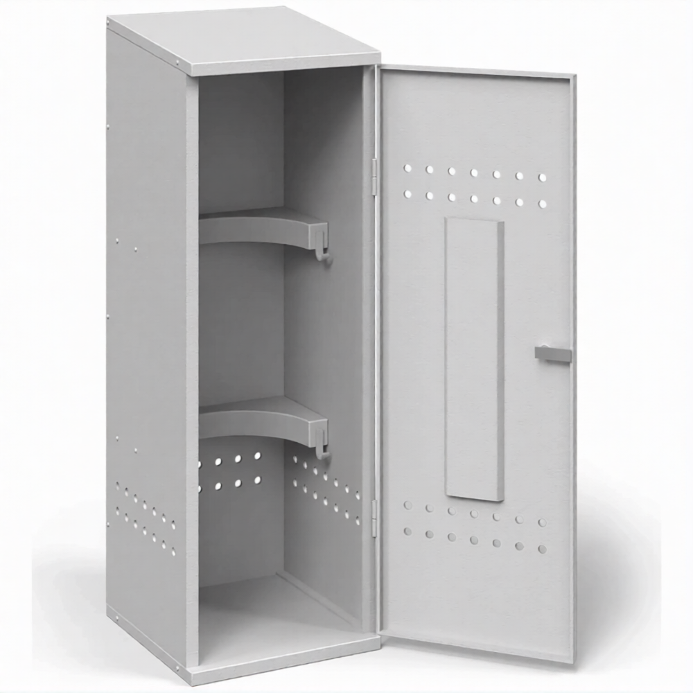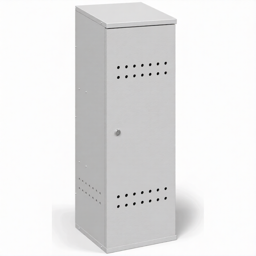 - Соблюдение высоких стандартов пожарной безопасности — шкаф изготовлен из стали толщиной 1,2 мм и оснащен всеми необходимыми элементами: запирающейся дверцей с надежным замком и системой вентиляции (перфорацией) в нижней и верхней части корпуса. Это обеспечивает надежную изоляцию баллона и безопасный отвод газа в случае утечки, предотвращая образование взрывоопасной концентрации.
