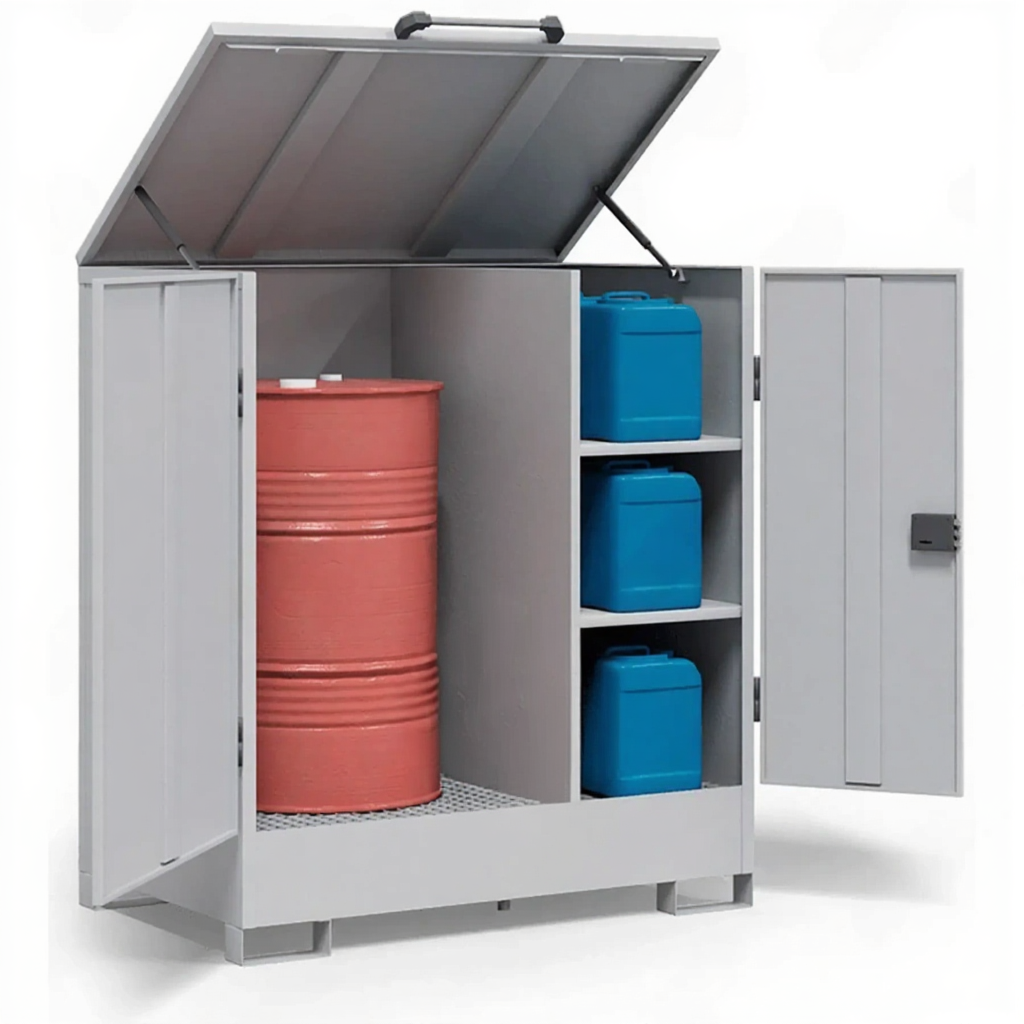 - Универсальность хранения — позволяет компактно хранить как основную большую емкость (бочку), так и дополнительные расходные материалы в канистрах, что оптимизирует пространство и логистику на рабочем месте.