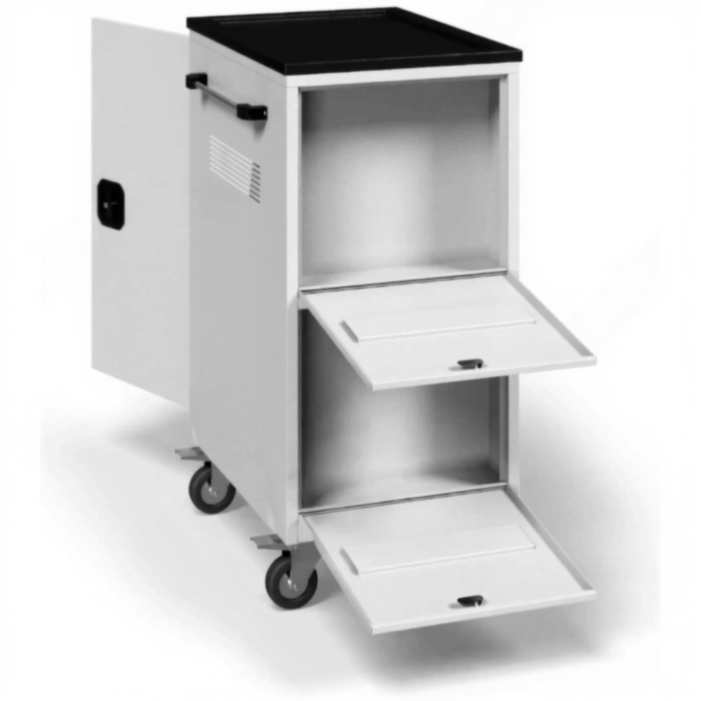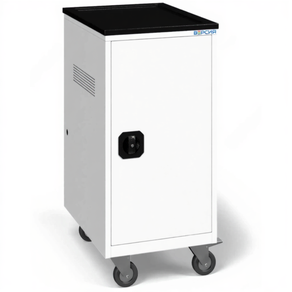 - Надежная защита и мобильность — прочная металлическая конструкция с запирающимися дверцами защищает технику от кражи и повреждений. Колеса позволяют легко перемещать тележку между кабинетами или помещениями.