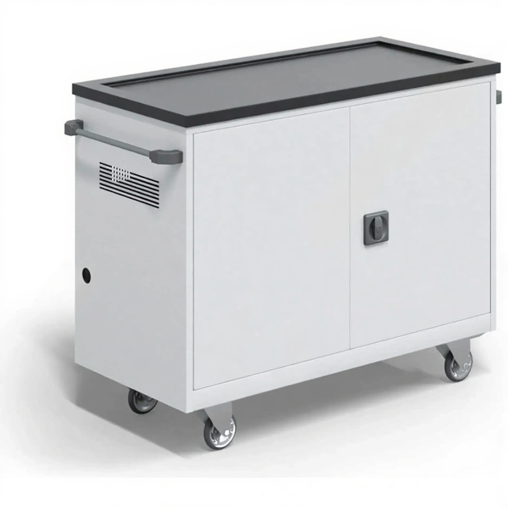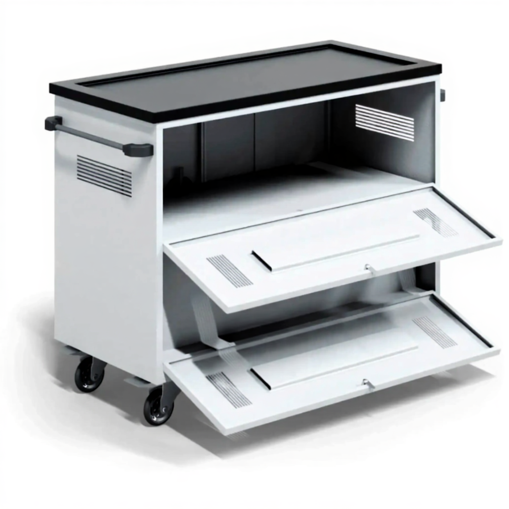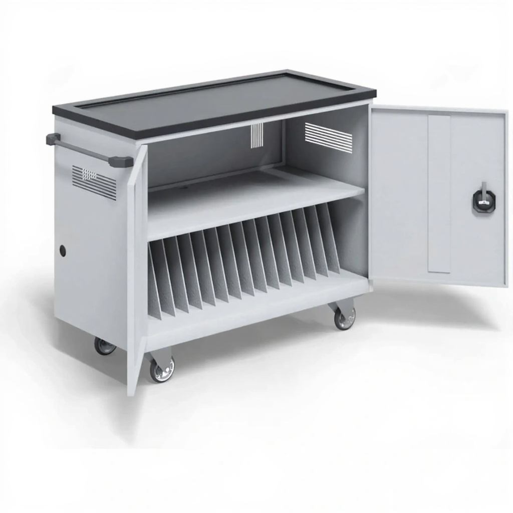 - Надежная защита и сохранность — прочный металлический корпус с запирающимися дверцами защищает технику от кражи, повреждений и пыли. Индивидуальные отсеки или полки предотвращают повреждение устройств при транспортировке.