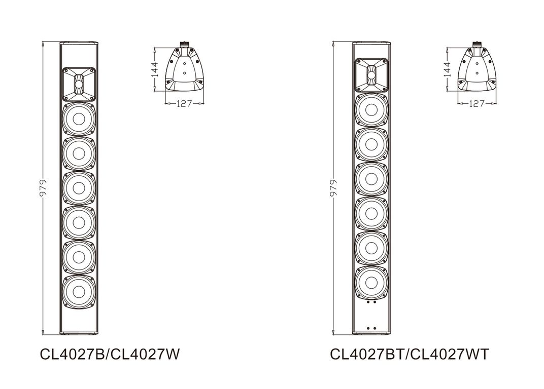 Серия CL4027 представляет собой акустическую систему колонного типа с различными цветами и функциями. Продукт соответствует стандарту IP56. Звук мягкий и сбалансированный. Корпус изготовлен из алюминиевого сплава. Буквы B и W после модели обозначают черный и белый цвет соответственно, а буква T представляет собой конфигурацию с трансформатором.